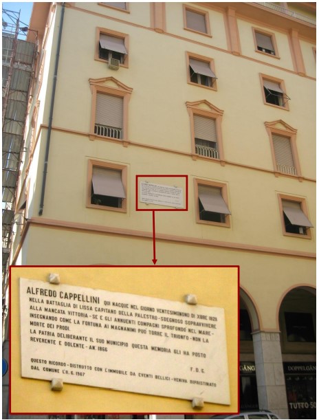 Più avanti, in corrispondenza dell’attuale civico n. 115, si trovava la casa natale di Alfredo Cappellini, il valoroso ufficiale della Regia Marina che morì a seguito di uno scontro con gli austriaci nelle acque dell’isola di Lissa nel luglio del 1866. L’epigrafe che si trovava qui proprio dal 1866, dettata da F. D. Gerrazzi, era commemorativa della casa natale del Cappellini, ma ricordava anche le circostanze dell’eroica morte dell’ufficiale: a seguito dell’incendio scoppiato sulla corazzata Palestro, da lui comandata, Cappellini, con sangue freddo e nonostante le proposte di abbandonare la nave, ordinò di allontanarsi dallo scontro per tentare di domare le fiamme insieme all’equipaggio. Purtroppo gli sforzi (durati oltre due ore) furono vani e la nave esplose, causando la morte del comandante insieme a tutto l’equipaggio. A seguito di questo evento, si diffuse l’idea che si fosse trattato di un suicidio collettivo, mentre in realtà nelle azioni del Cappellini c’era la speranza effettiva di poter salvare la nave; tale lettura errata traspariva anche dall’epigrafe, che recitava: