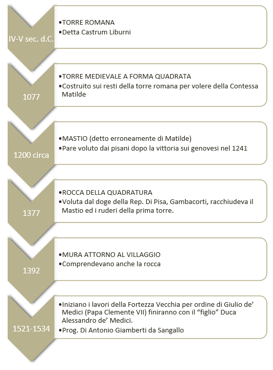 Sopra i ruderi dal 1077 fu costruita la torre medievale (a base quadrata), secondo la tradizione voluta da Matilde. Dunque, intorno al Mille sembra vi fosse stato un villaggio (Livorna) sotto la protezione del castrum liburni, che secondo l’atto di donazione del 1103 Matilde Contessa di Toscana donò all’Opera di S. Maria di Pisa (il “Castrum Liburni, curtem et omnia similier ei pertinentia”). Il villaggio rimase privo di mura fino al 1392 e la torre fu infatti distrutta ben dodici volte dal 1114 al 1368 per cause belliche. Si deve forse al 1241, a seguito di una vittoria di Pisa sui genovesi, la costruzione del mastio, quella torre conosciuta poi popolarmente come “di Matilde”, poiché si riteneva fosse stata costruita al suo tempo nel 1077; tale equivoco ha origini seicentesche, quando fu identificato il castrum con il mastio. L’origine dello sviluppo cittadino tra l’XI e il XV secolo non è chiaro poiché non ne abbiamo traccia: il vecchio nucleo abitato fu assorbito e trasformato dalla città seicentesca.