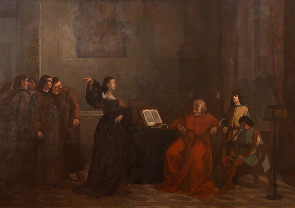 Da allora gli storici dell’arte hanno cercato di fare chiarezza sulla genesi e sull’iconografia del dipinto scoperto: questo, dal soggetto storico antico, si ritiene che raffiguri un episodio della nascita della repubblica fiorentina, ossia il momento in cui Clarice Strozzi, in presenza del cardinale di Cortona, esortava i giovani Alessandro e Ippolito Medici a lasciare Firenze, dove ormai aveva trionfato il partito repubblicano; si tratterebbe quindi di quell’opera di gusto accademico che si riteneva ormai perduta, ossia il dipinto che aveva come soggetto un “fatto di casa Medici” di cui Fattori aveva parlato in tarda età, spiegando come la sua esecuzione non gli fosse stata congeniale. Alcune lettere dell’artista, inoltre, hanno poi confermato che la Battaglia di Montebello era andata a sostituire un’opera di soggetto storico precedentemente commissionata. È possibile che Fattori, ricevuta la commissione dai cittadini livornesi, avesse dunque iniziato l’opera di stampo accademico (per iconografia e stile) prendendo spunto per il soggetto da un episodio presente nel romanzo storico Assedio di Firenze del Guerrazzi e da alcuni dipinti coevi che raffiguravano la stessa vicenda (che si addiceva al clima patriottico risorgimentale); per documentarsi storicamente sul fatto, probabilmente l’artista si servì anche delle Storie fiorentine di Bernardo Segni, in cui la vicenda è narrata con esatto riscontro nel dipinto. A seguito, poi, della visita dell’amico Nino Costa nel 1859 (il quale esortò l’artista ad abbandonare la grande tela di soggetto mediceo per dedicarsi alla pittura di macchia che egli aveva iniziato a sviluppare) e del successo ottenuto dalle sue prime opere dal soggetto storico contemporaneo, si ritiene che Fattori fosse riuscito a convincere i sottoscrittori a cambiare il soggetto della tela commissionata.