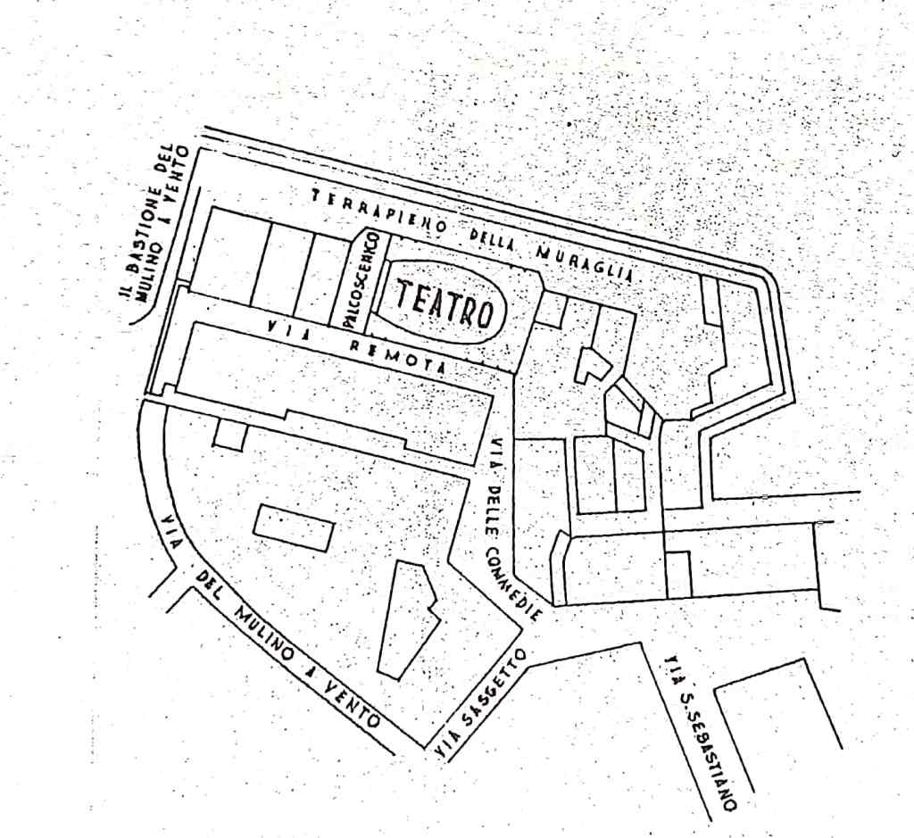 Procedendo verso il mare, giungiamo sulla sinistra alla Via delle Commedie. Il nome si riferisce al fatto che un tempo in questa zona sorgeva il primo teatro di Livorno, lo “Stanzone delle Commedie”, noto anche come “Teatro di San Sebastiano”. Il teatro sorgeva all’angolo fra Via delle Commedie e la Via Remota, una strada non più esistente, sparita all’inizio degli anni Cinquanta del Novecento nell’ambito di un generale riassetto di tutta la zona a seguito delle distruzioni belliche.