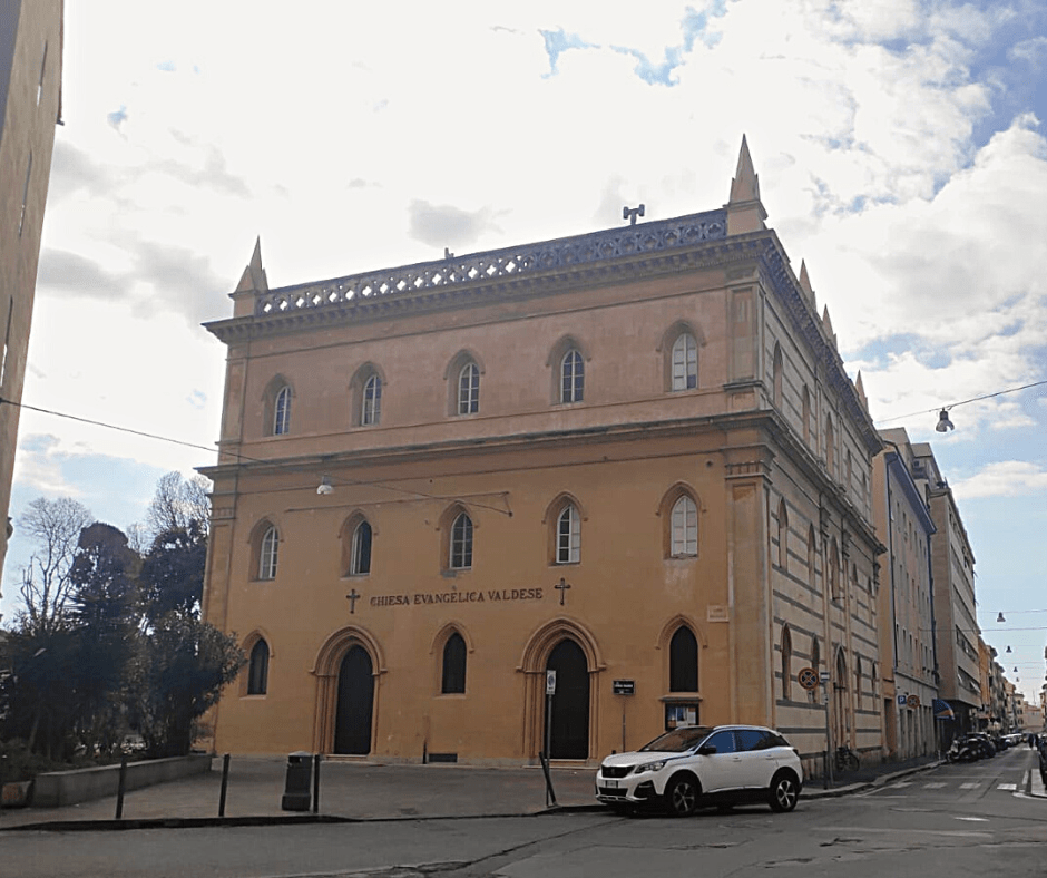 Proseguendo lungo Via Verdi, poco più avanti troviamo la Chiesa Presbiteriana Scozzese, dal 1910 di proprietà della comunità valdese. Inaugurata nel 1849, essa fu costruita con pianta rettangolare su progetto dell’architetto Rumball di Edimburgo in stile neogotico (ancora poco diffuso in Toscana, dove era preferito lo stile neoclassico), come evidenziano all’esterno la bicromia del paramento della facciata e le aperture ogivali simmetricamente distribuite. Come ricorda anche la nostra guida, all’interno spiccavano le vetrate policrome realizzate dalla vetreria Ballantine di Edimburgo, andate perdute.