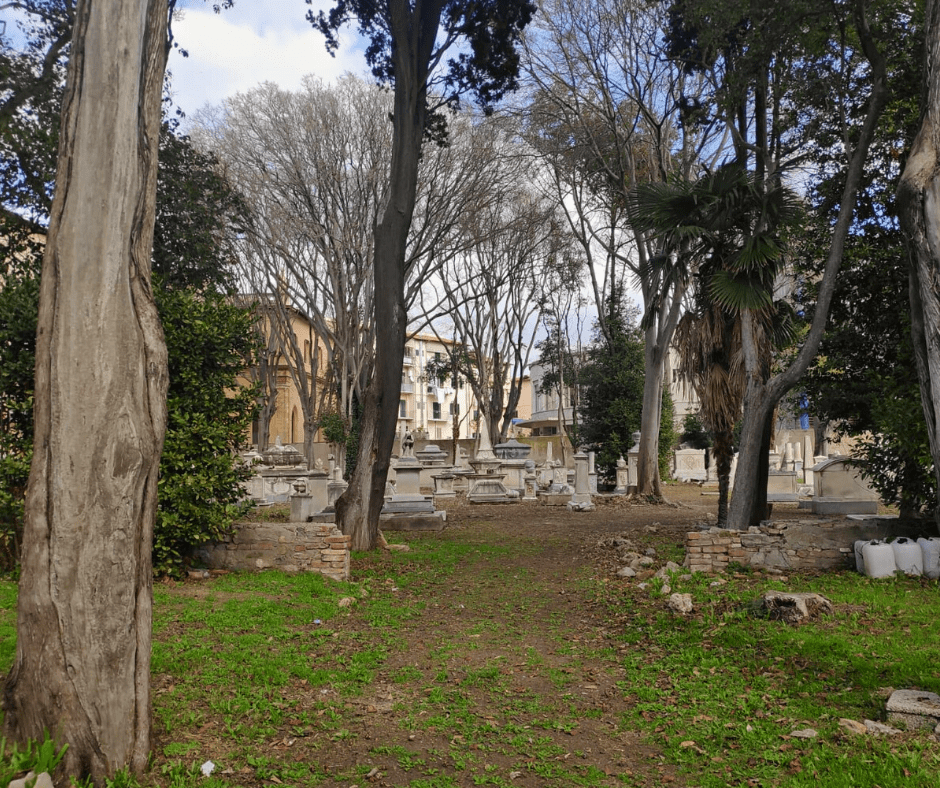 Usciti dalla Chiesa dei SS. Pietro e Paolo, volgendo a sinistra, appena imboccata la Via dell’Indipendenza, a destra si apre la breve Via degli Inglesi che mette in Via Verdi (…), e subito, in faccia, si apre la cancellata che conduce al Vecchio Cimitero ed alla Chiesa Anglicana (…).