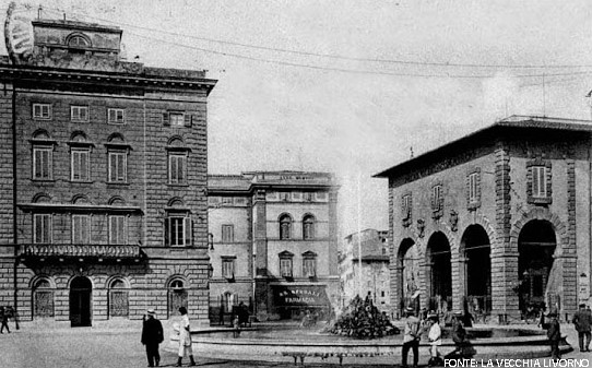 Concludiamo con questa tappa l’esplorazione di quella che un tempo era la vastissima Piazza Vittorio Emanuele: concentriamoci sull’edificio che un tempo ospitava la Borsa (attuale Camera di Commercio) e su quello della Prefettura (non più esistente). Successivamente c’imbatteremo in un pezzo di storia dell’editoria labronica.