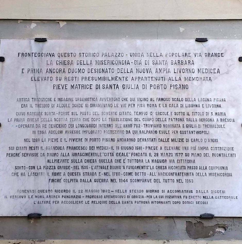 Procediamo adesso di nuovo lungo l’odierna Via Grande, verso l’omonima piazza. La nostra guida ci fa soffermare poco oltre Piazza Guerrazzi per ammirare un notevole luogo d’interesse: la Chiesa della Misericordia, nota anche come Chiesa di Santa Barbara. Ci troviamo purtroppo nuovamente davanti al caso di un edificio non più esistente, poiché anch’esso perduto a seguito del secondo conflitto mondiale. Di fronte al punto dove si trovava, dall’altra parte della strada, possiamo leggere la lapide a ricordo della chiesa (foto in alto).